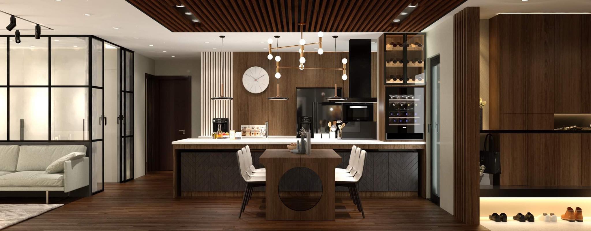 Người thiết kế tạo điểm nhấn cho căn hộ bằng các vật liệu vân gỗ và các loại đèn trang trí
