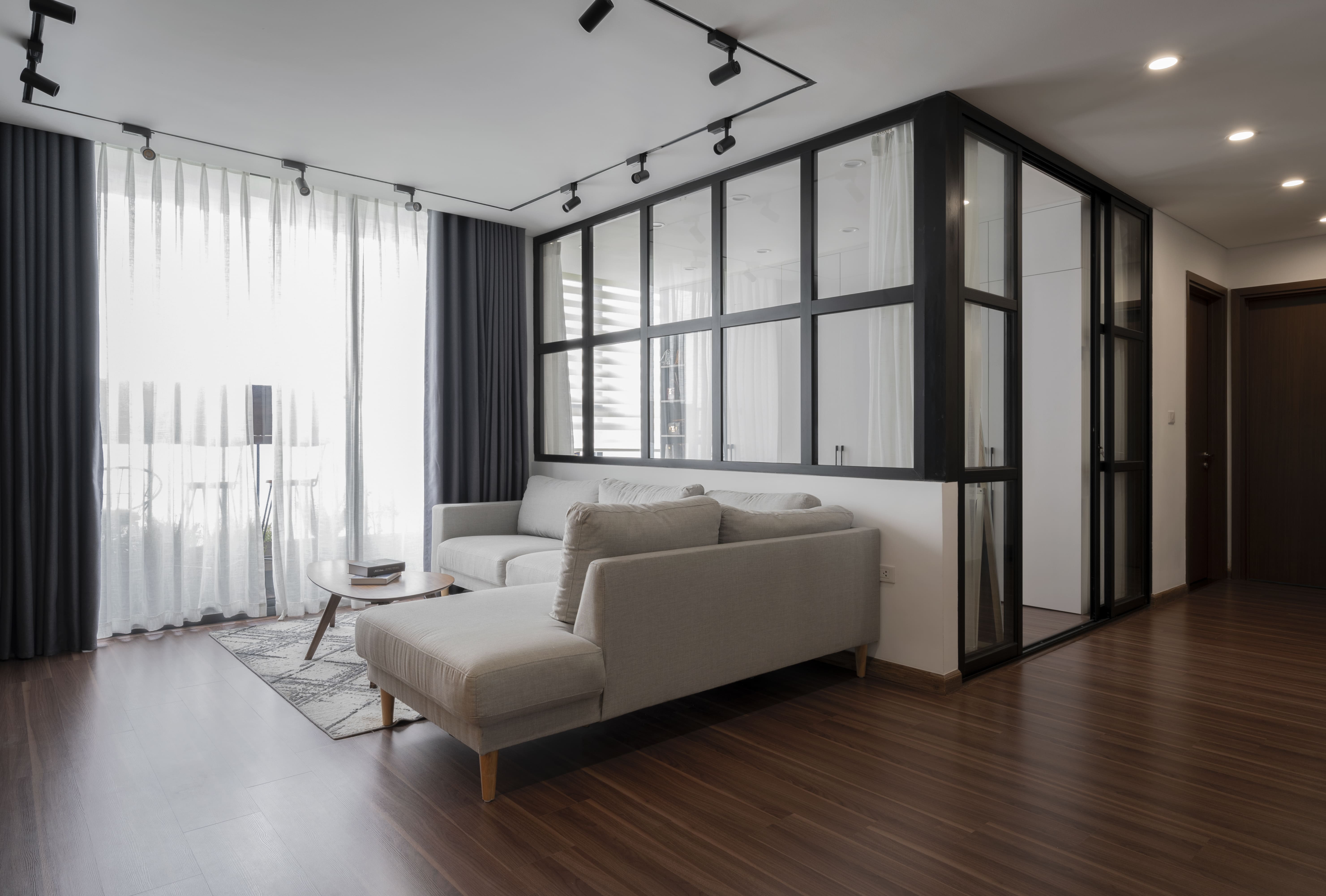 - Thiết kế nhiều cửa kính tạo cảm giác thông thoáng: Căn hộ sử dụng rất nhiều cửa kính để tận dụng được nguồn sáng tự nhiên, đồng thời cho phép gia chủ tận hưởng cảnh quan bên ngoài. Vách kính lớn vừa đảm bảo ngăn cách các khu vực trong căn hộ vừa giúp mở rộng tầm nhìn tạo cảm giác thông thoáng.