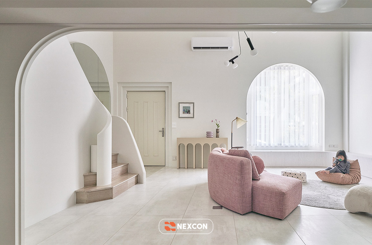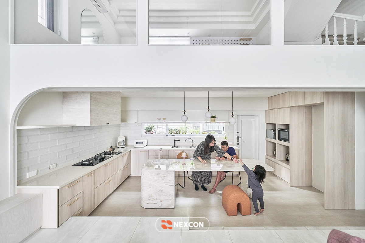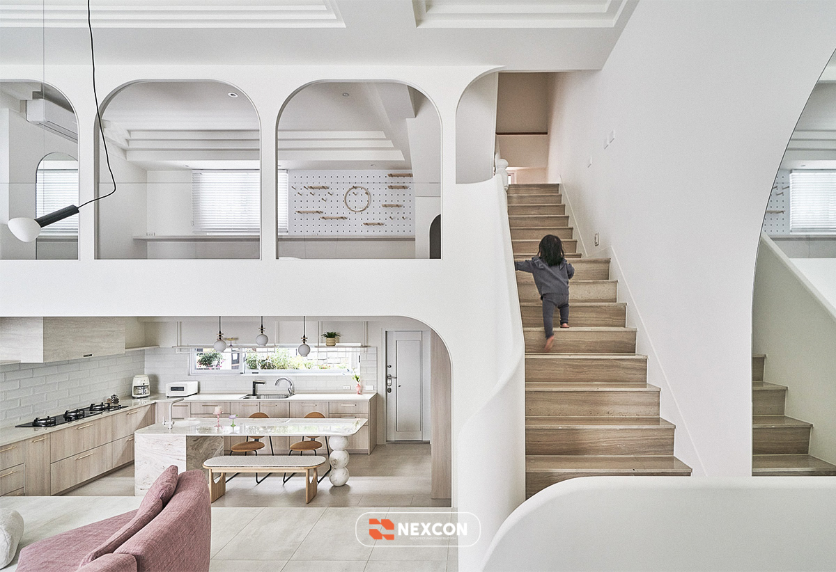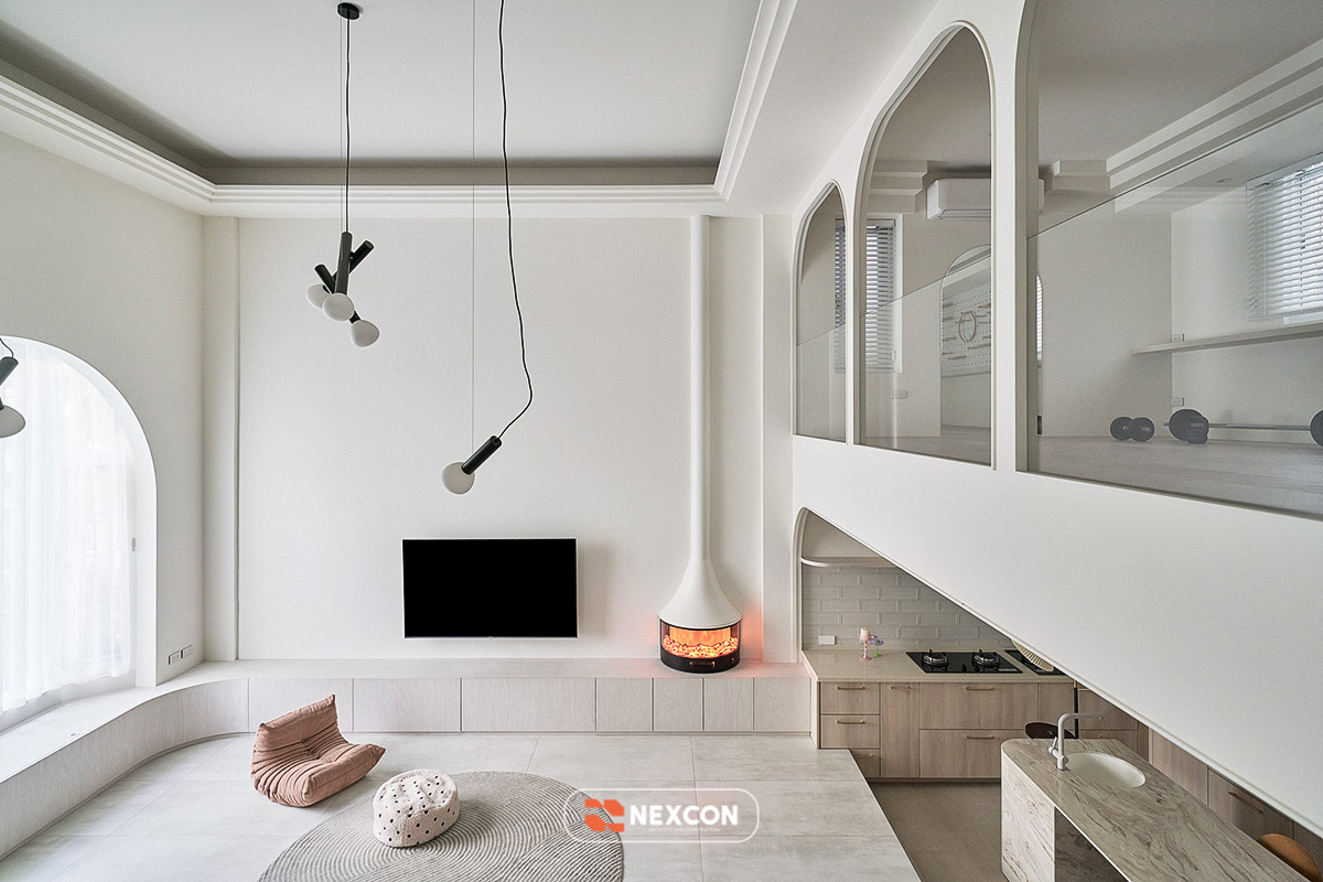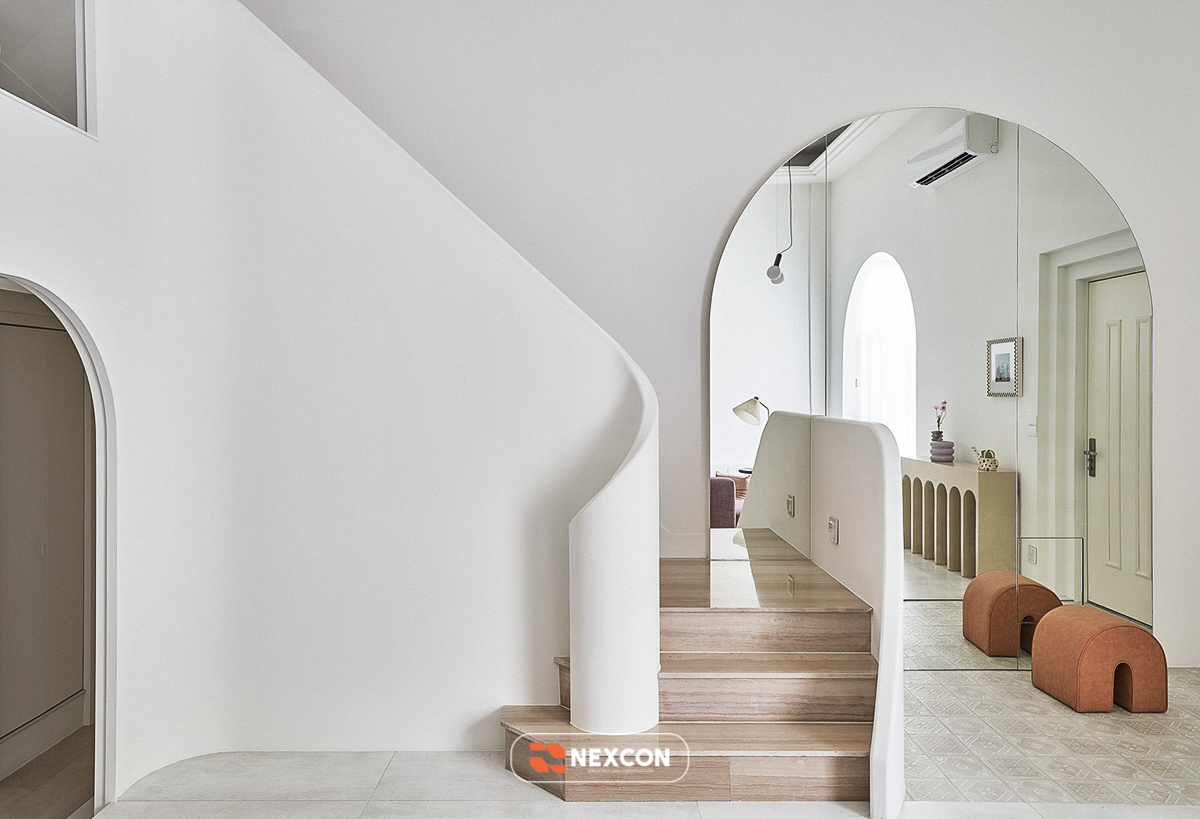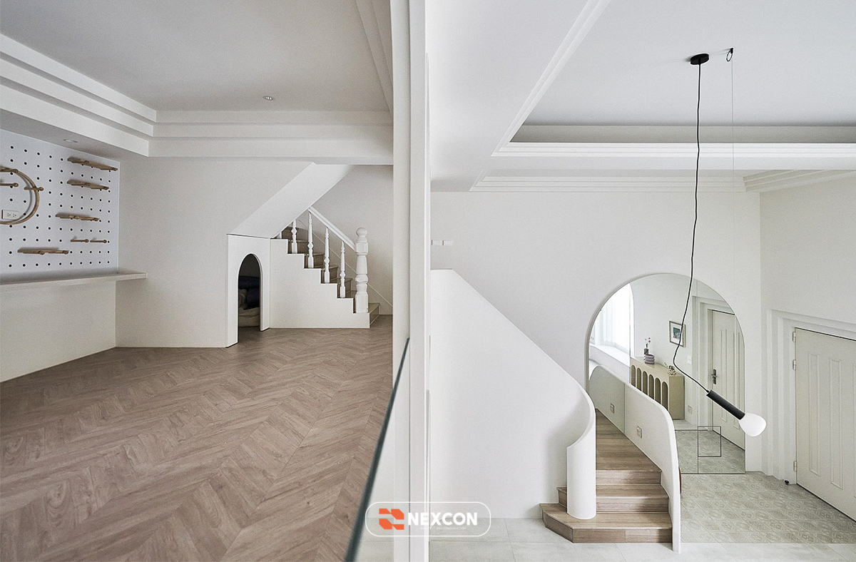 Các đường nét chạm khắc phức tạp của ngôi nhà ban đầu đã bị phai màu và chỉ giữ lại một số yếu tố phong cách châu Âu, được sơn màu trắng tinh khiết, sau đó được thêm các hình vòng cung và mái vòm để phác thảo bầu không khí đơn giản nhưng cổ điển, tái tạo cảm giác không gian cao và rộng mở.