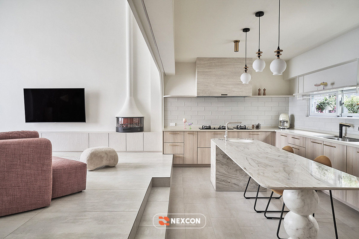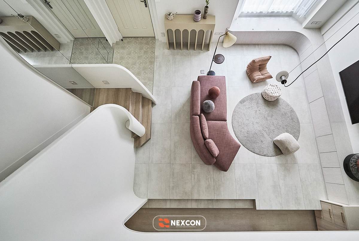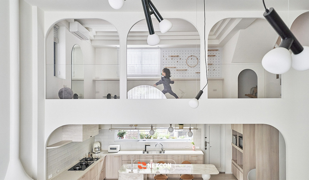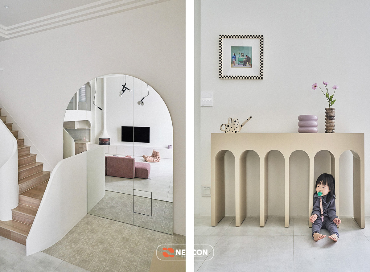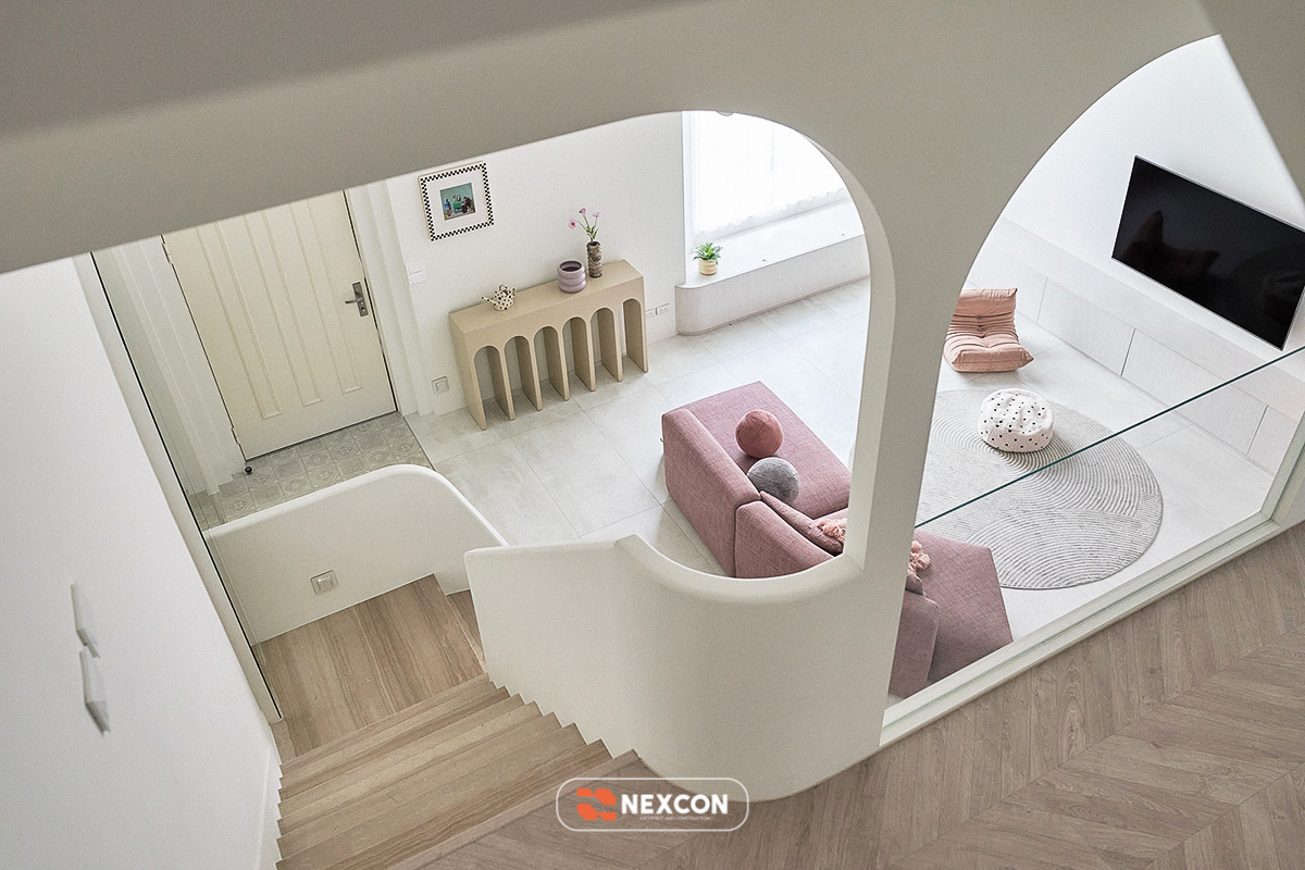 Các đường nét chạm khắc phức tạp của ngôi nhà ban đầu đã bị phai màu và chỉ giữ lại một số yếu tố phong cách châu Âu, được sơn màu trắng tinh khiết, sau đó được thêm các hình vòng cung và mái vòm để phác thảo bầu không khí đơn giản nhưng cổ điển, tái tạo cảm giác không gian cao và rộng mở.
