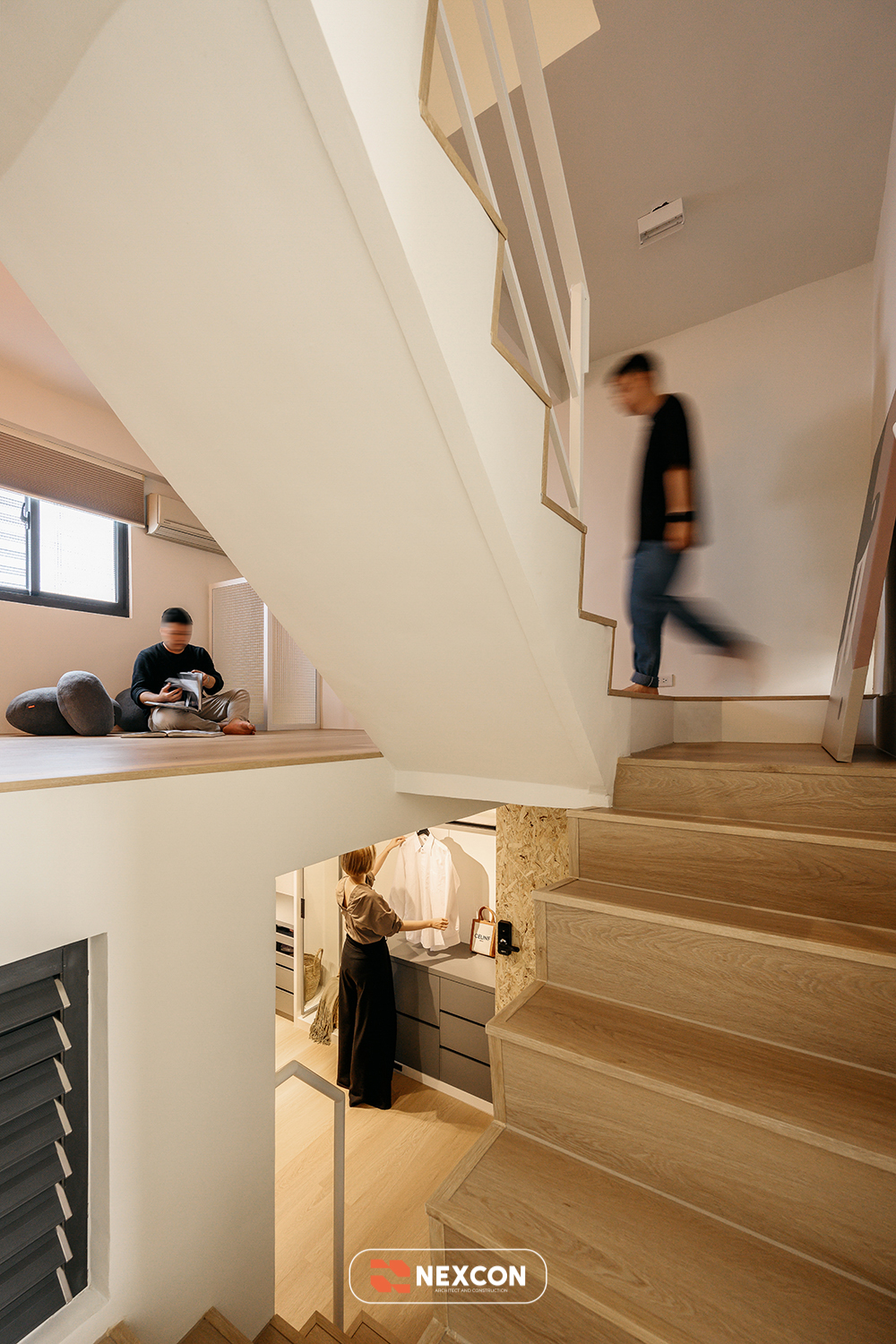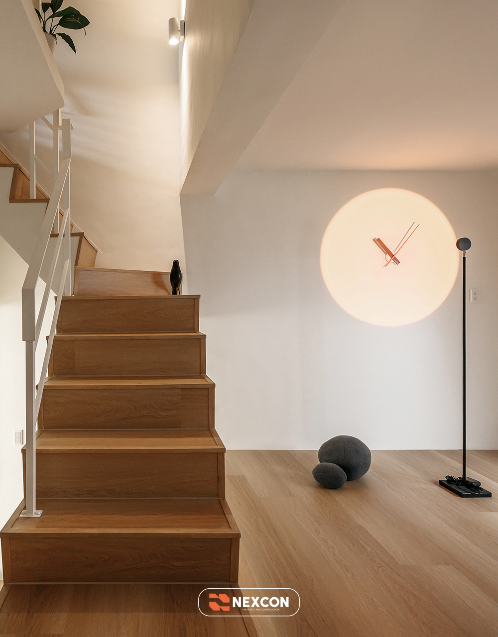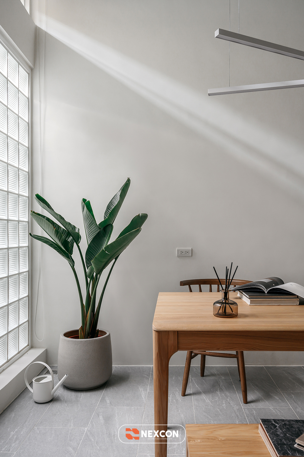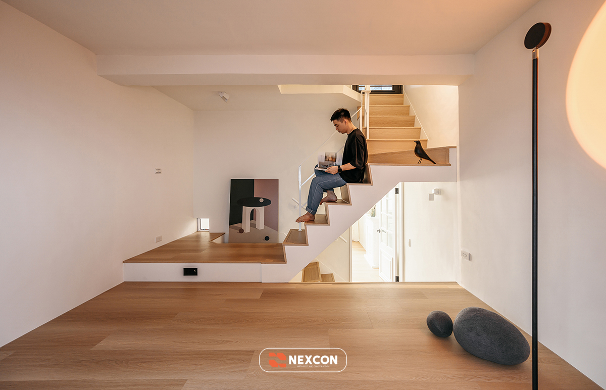 Mở cửa, NEXCON đặt nền móng cho sự đơn giản tối đa, những bức tường trắng trơn được trang bị gạch lát sàn giả đá màu xám bổ sung cho nhau và tạo hình chân đế đơn giản, tạo cho không gian sự cá tính.