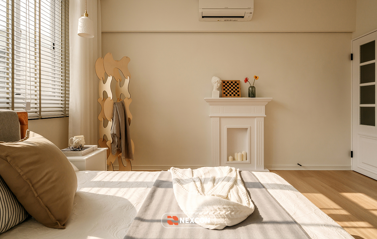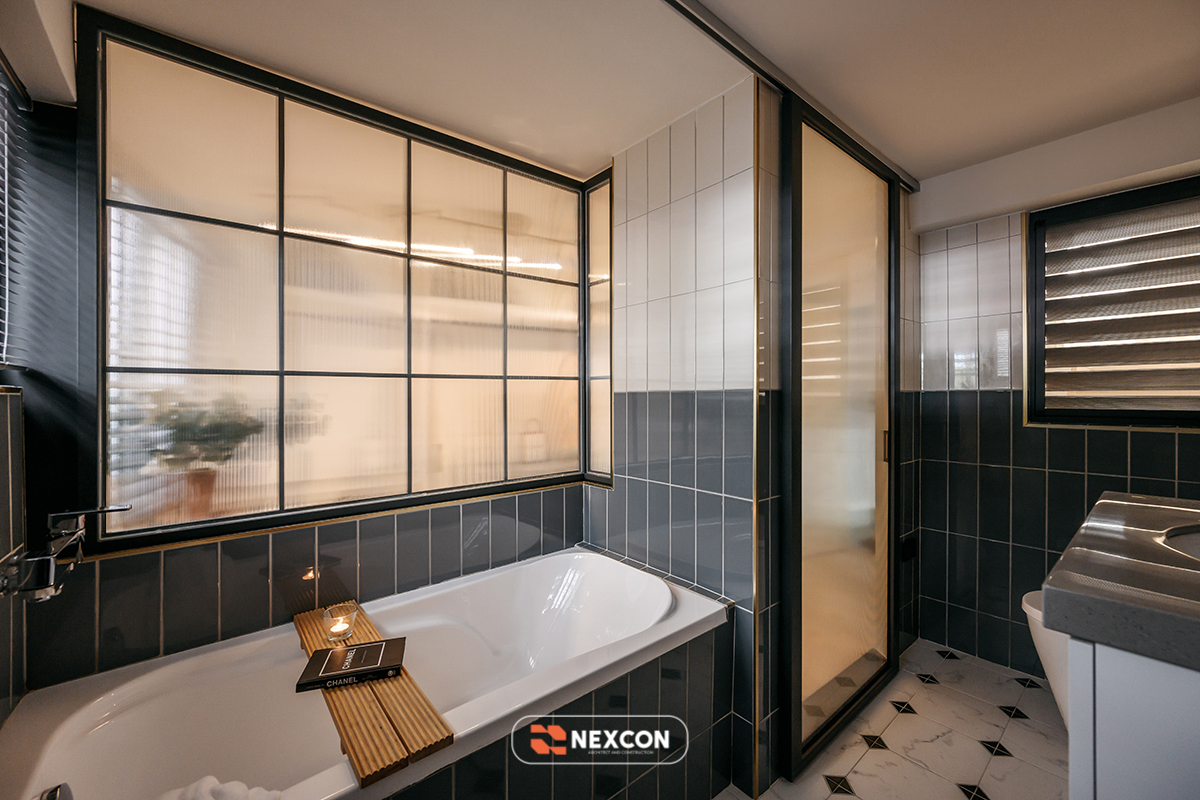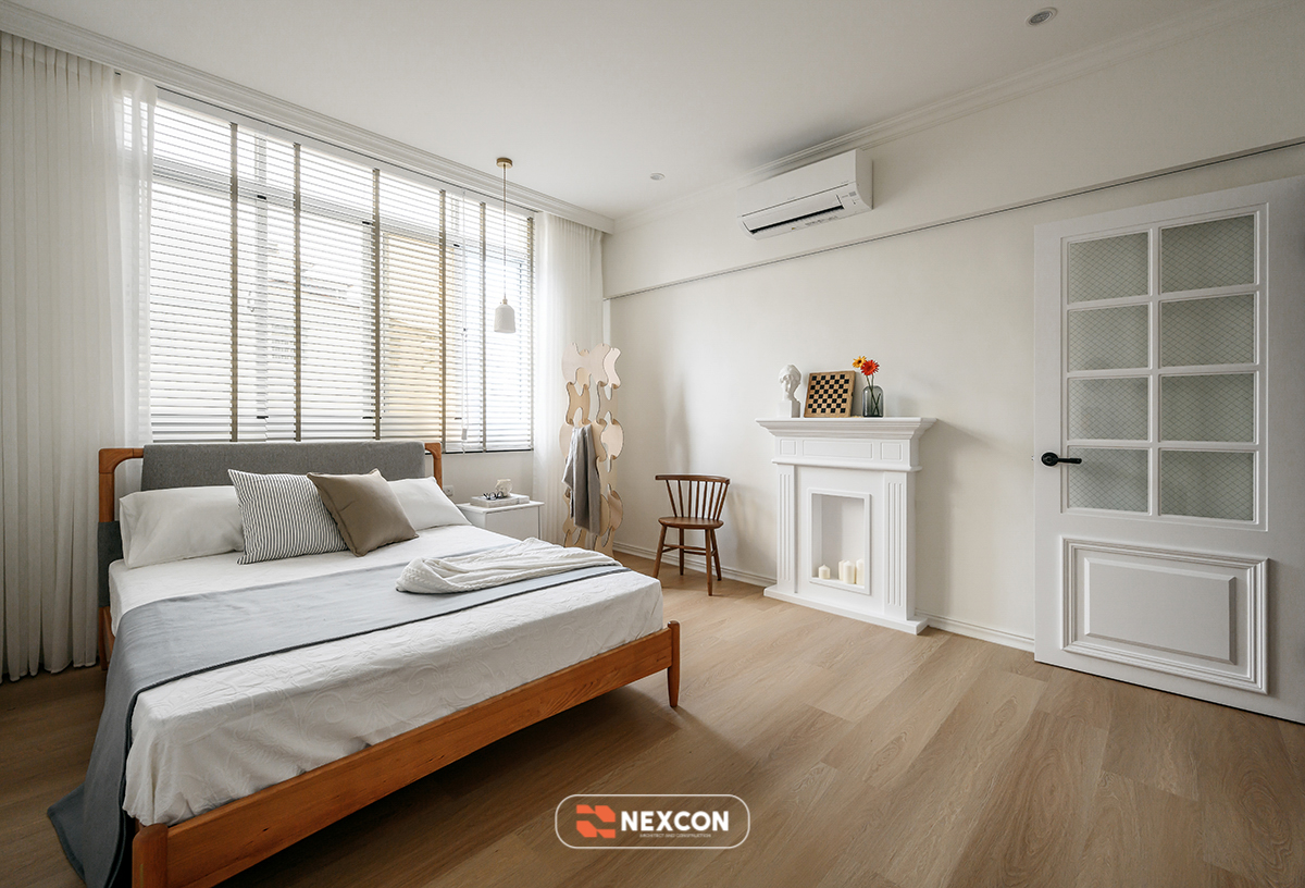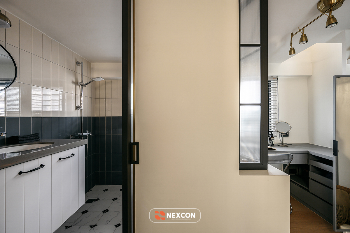 Mở cửa, NEXCON đặt nền móng cho sự đơn giản tối đa, những bức tường trắng trơn được trang bị gạch lát sàn giả đá màu xám bổ sung cho nhau và tạo hình chân đế đơn giản, tạo cho không gian sự cá tính.
